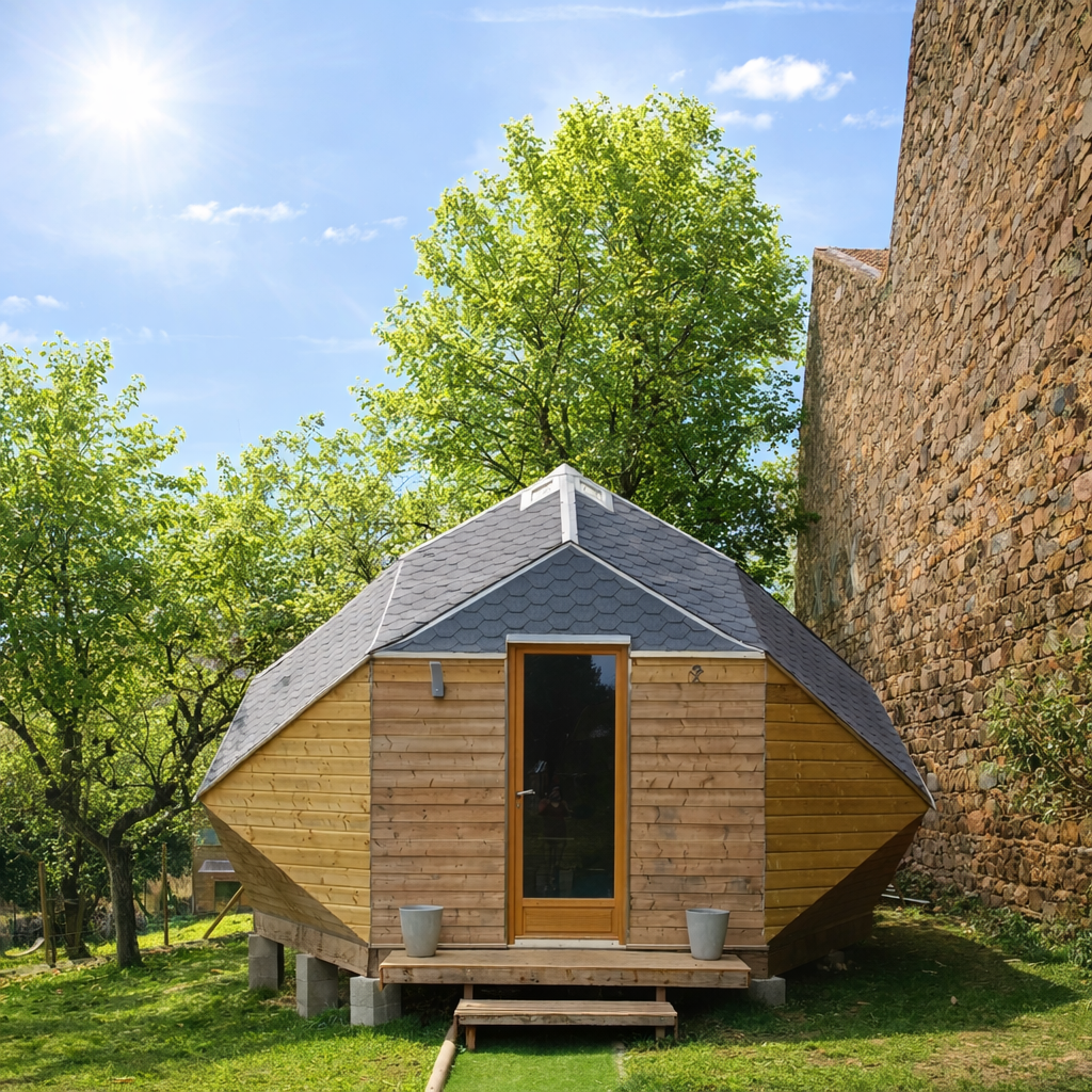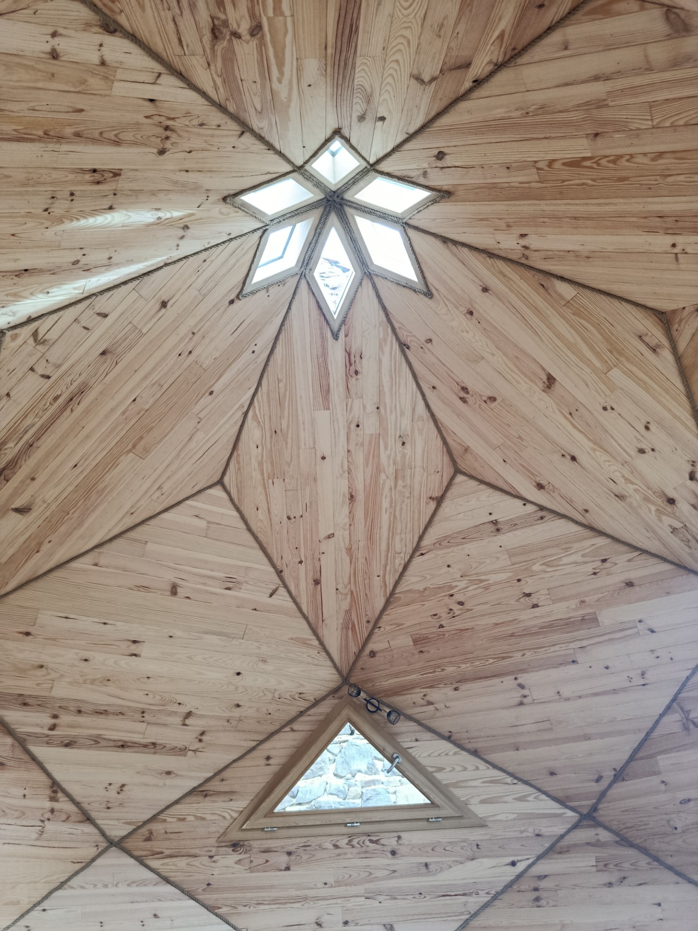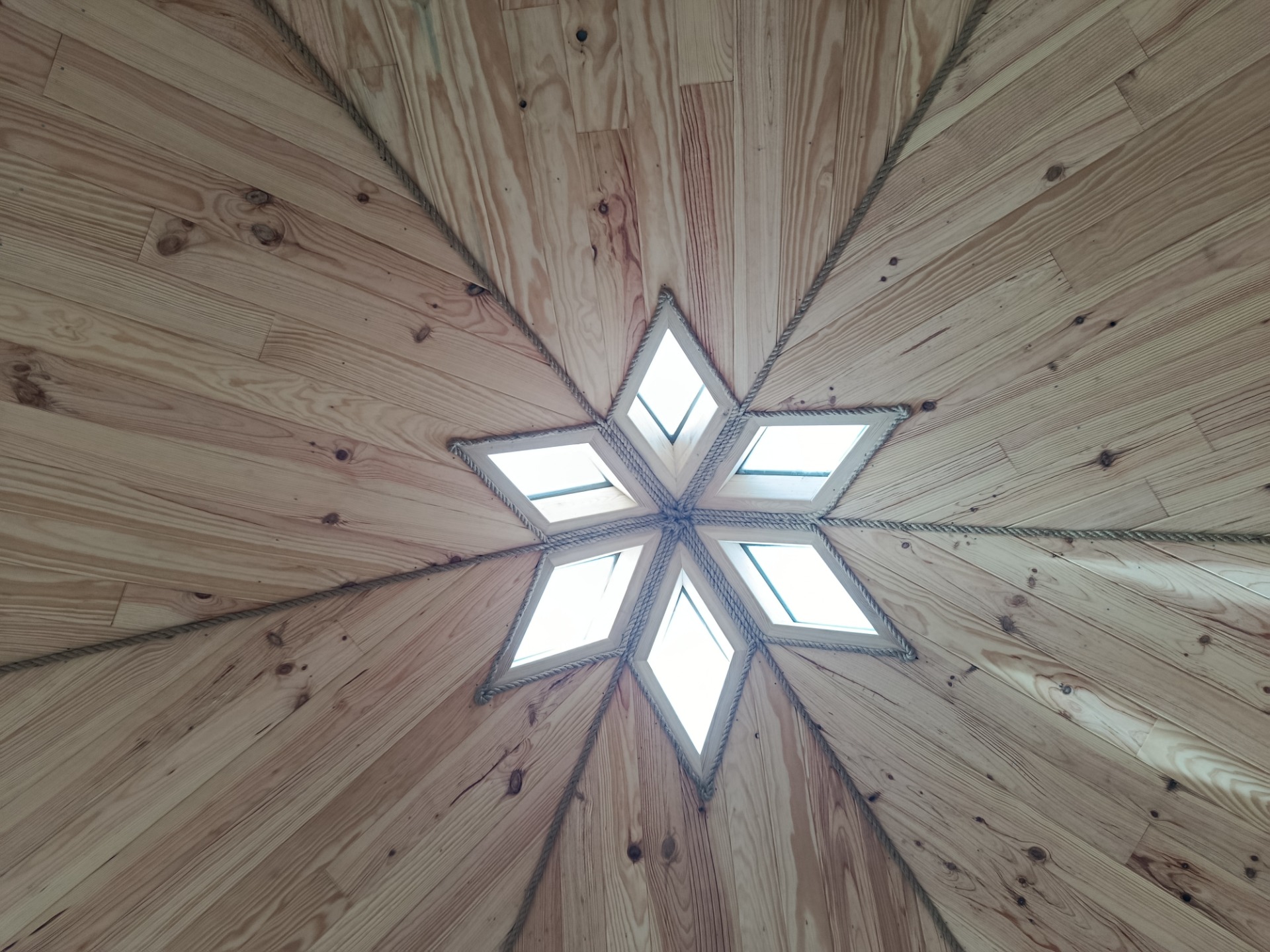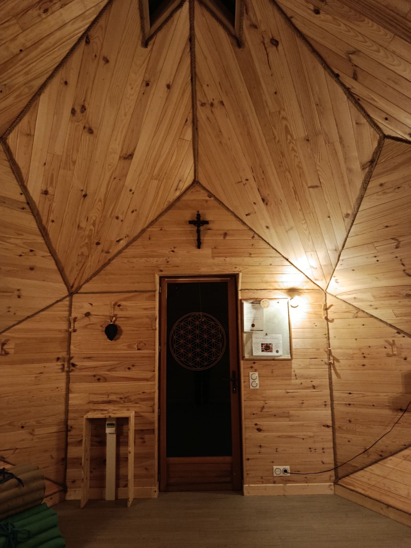 Installez-vous dans un espace pensé pour votre bien être et celui de vos clients. Le zome géodésique est une géométrie sacré conçu pour avoir un taux vibratoire élevé. Son intérieur tout en bois vous assure un environnement cosy et sécurisant. Il est propice à la détente, la méditation l'apprentissage et la création. Avec une belle luminosité du à sa rosace centrale ainsi que ses 2 fenêtres latérales, vous pourrez également profiter du ciel et de l'extérieur.