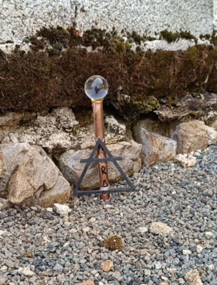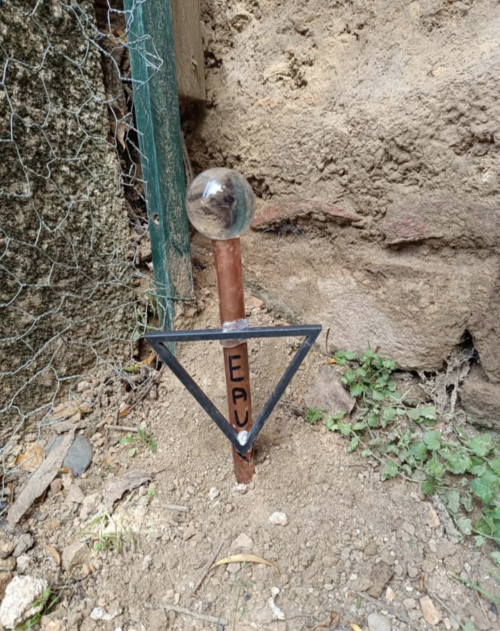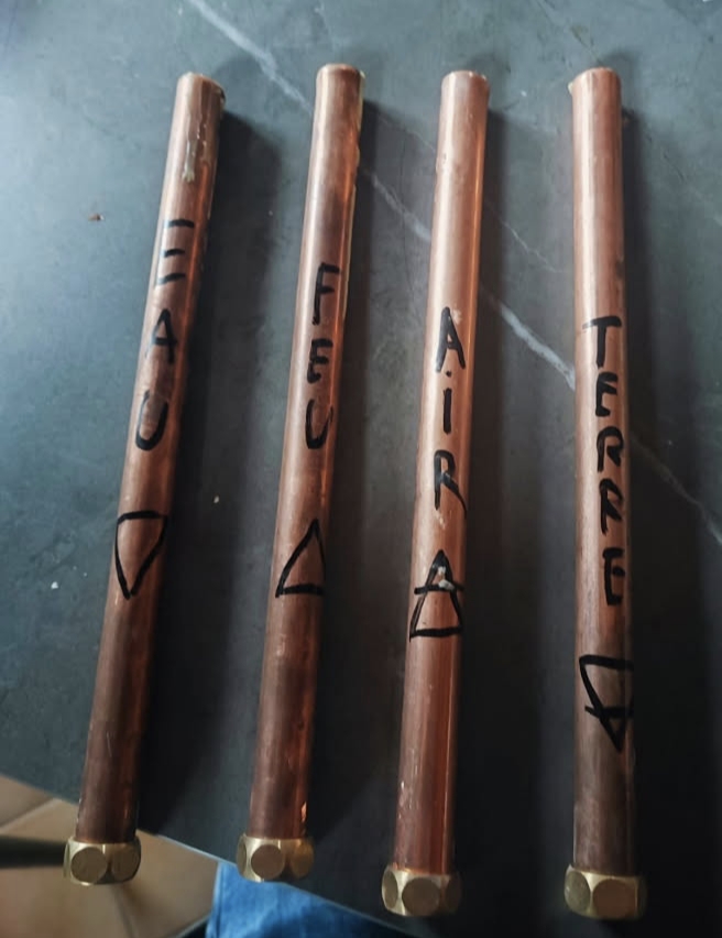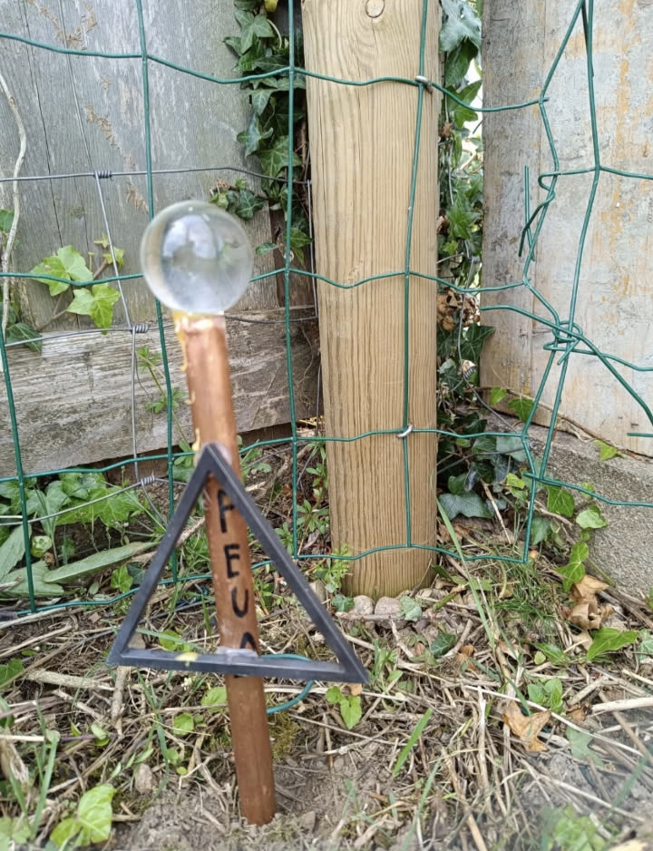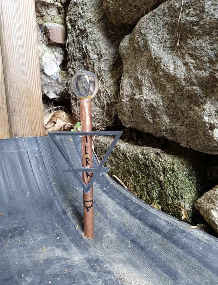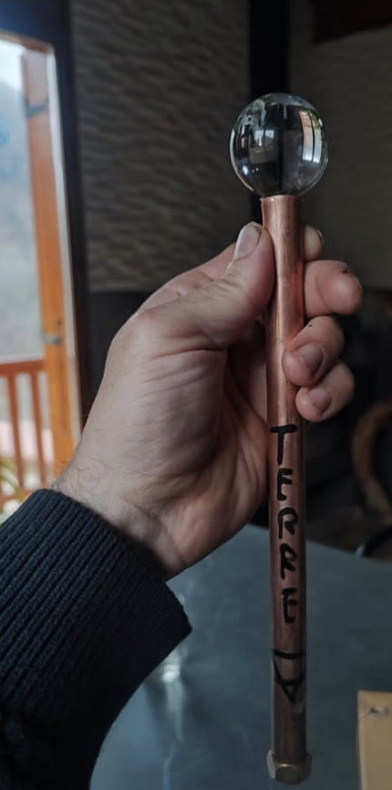 Ces piquets de cuivre de géobiologie sont des dynamiseurs pour un terrain. Ils sont composés d'un tube en cuivre, de condensateurs alchimique des 4 éléments, d'une boule de cristal et de cire d'abeille. Ils neutralisent toutes les énergies négatives cosmique et telluriques et sont à placer aux 4 coins de votre terrain suivant les directions cardinales et les 4 éléments.