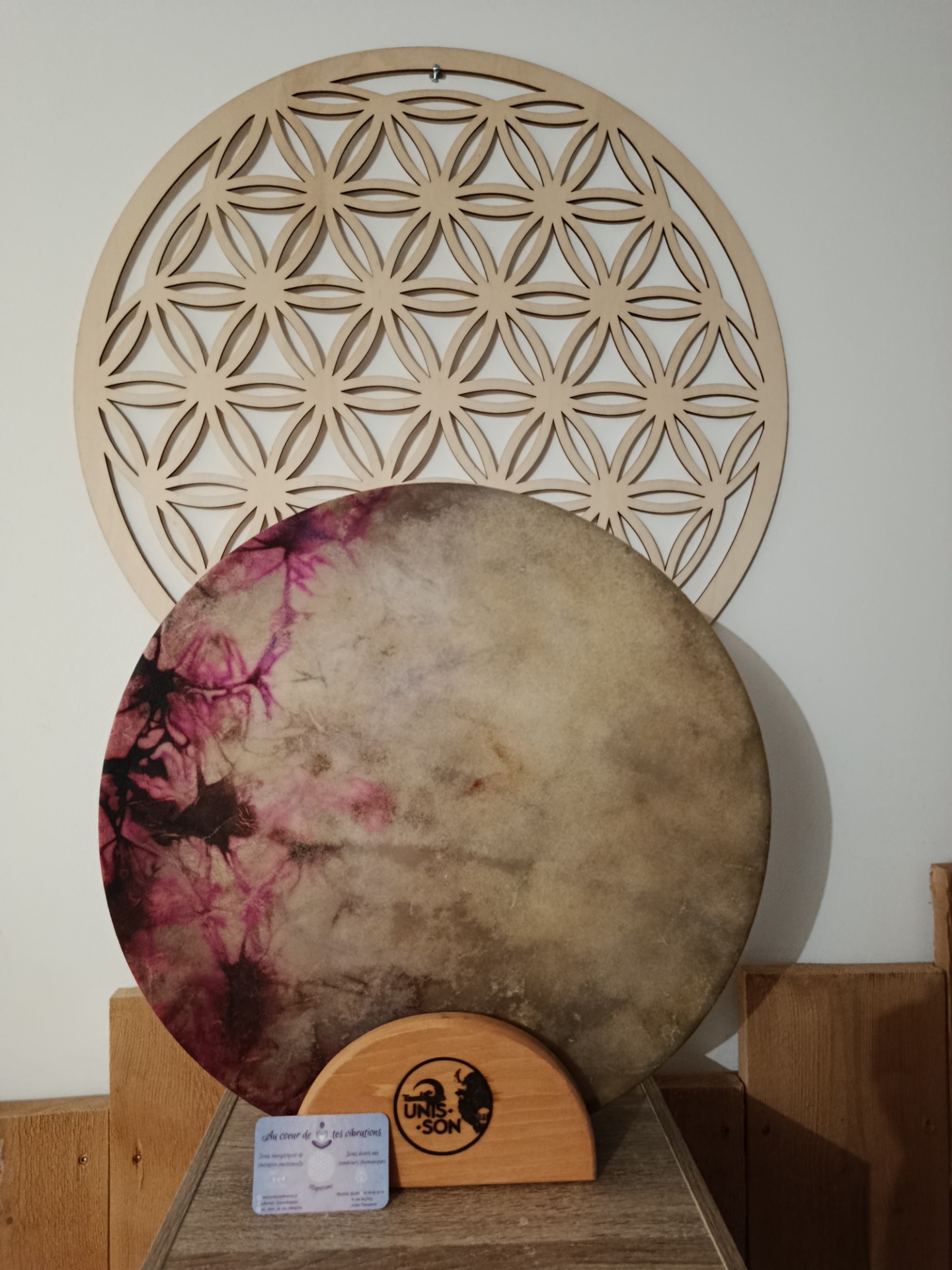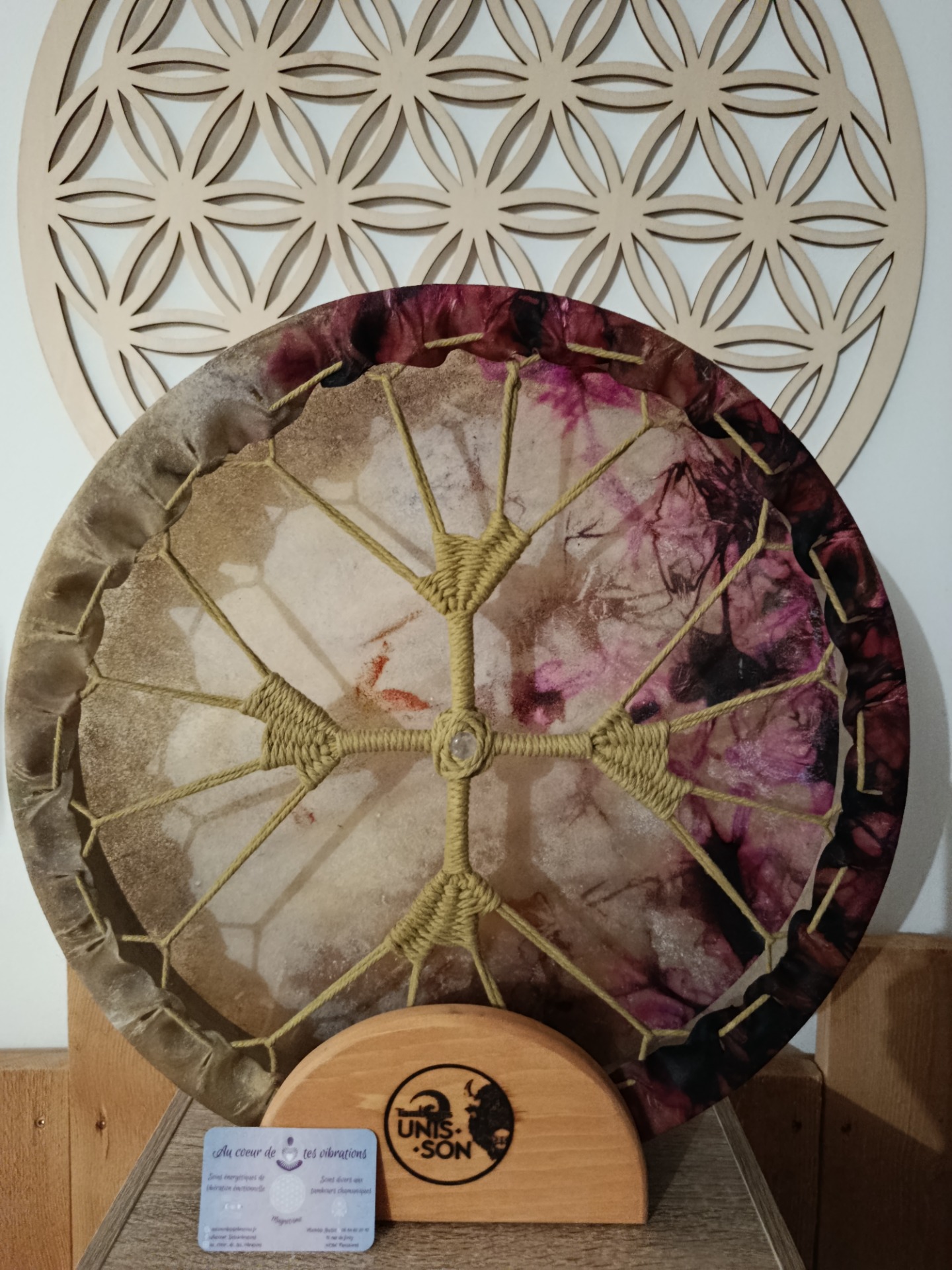 Les Tambours Unis-Son sont composés d'un cercle en érable très résistant aux variations d'humidité. Les peaux de bison sont choisies avec grand soin et l'intention est d'honorer les animaux desquels ils proviennent (destinés à la consommation alimentaire). La poignée en 100% coton contient une pierre au milieu pour celui ci c'est du quartz rose. Une mailloche est incluse avec tout achat de tambour. J'offre une garantie complète d'un an sur toutes les créations. Le tambour est un outil vibratoire pour nous ancrer dans notre pouvoir créateur, nous reconnecter à notre vibration d'origine. Ils sont fabriqués à la main avec amour au Québec.