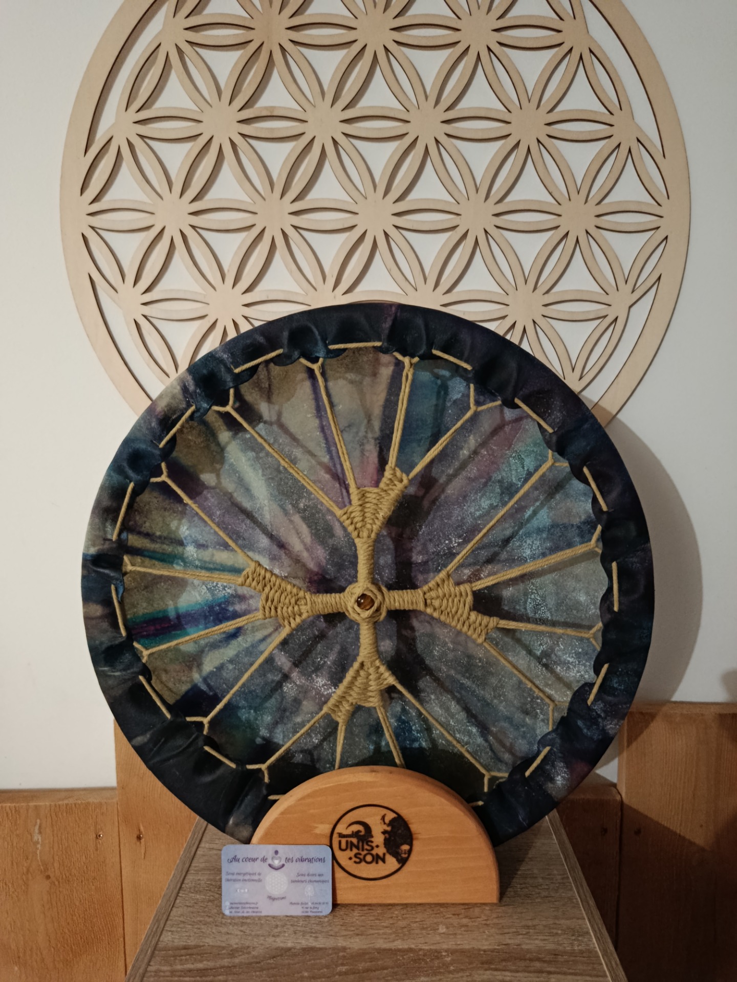 Les Tambours Unis-Son sont composés d'un cercle en érable très résistant aux variations d'humidité. Les peaux de bison sont choisies avec grand soin et l'intention est d'honorer les animaux desquels ils proviennent (destinés à la consommation alimentaire). La poignée en 100% coton contient une pierre au milieu pour celui ci c'est un œil de tigre. Une mailloche est incluse avec tout achat de tambour. J'offre une garantie complète d'un an sur toutes les créations. Le tambour est un outil vibratoire pour nous ancrer dans notre pouvoir créateur, nous reconnecter à notre vibration d'origine. Ils sont fabriqués à la main avec amour au Québec.